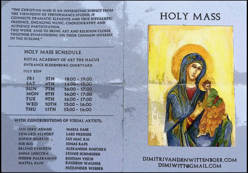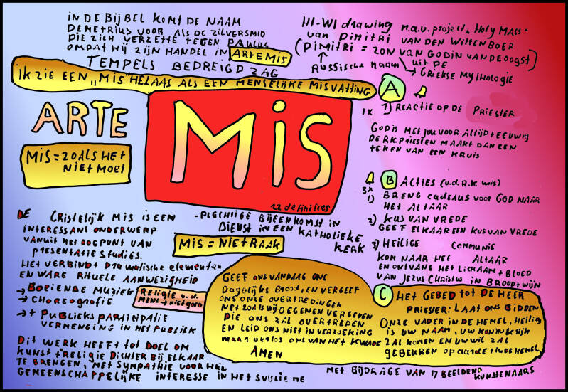 studeerde op een zeer bijzondere wijze af en dat was namelijk met een mis. Wat is een mis vroeg ik me gelijk af? Oh, dat is toch zoiets van de Katholieke Kerk? Iets waar toch zoveel mistoestanden door zijn ontstaan? Ja, dat was het en dat was in mijn voorstelling natuurlijk allemeel nog steeds goed mis. Toch ben ik graag gaan kijken, gewoon omdat ik zelf op latere leeftijd gelovig ben geworden en ik zeker benieuwd was, hoe dit op een kunstacademiet kon worden opgevat. Toen ik op een tafel ging zitten kwam ik toevallig gelijk in gesprek met Dimitri en dat was gelijk erg leuk. Niet dat ik het met het begrip MIS eens was. Nee, ik vond dat nog steeds goed mis. Maar meer om te willen weten van wat Dimitri er mee wilde zeggen. Ja en dat beviel me wel.