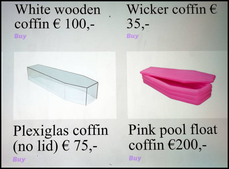 Bij het zien van deze verzameling doodskisten van Jill Louise Verweijen, moest ik ogenblikkelijk danken aan mijn onlangs overleden vriendin Genovera die vorig jaar op 83 jarige leeftijd de mensen op aarde heeft verlaten en haar lichaam daarbij achtergelaten.