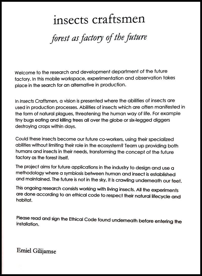 Welkom bij de reseaurch en ontwikkelingsafdeling van de toekomstige fabriek. In deze mobiele werkomgeving vinden experimenten en observaties plaats in de zoektocht naar een alternatief in productie. In Insects Craftsmen wordt een visie gepresenteerd waarin de vaardigheden van insecten worden gebruikt in productieprocessen. Vermogen van insecten die zich vaak manifesteren in de vorm van natuurlijke plagen. Plagen die de mens bedreigen en die zich vaak manifesteren in de vorm van natuurlijke plagen, die de menselijke manier van leven bedreigen. Bijvoorbeeld kleine beestjes die bomen over de hele wereld eten en doden of zespotige gravers van vernietigende gewassen binnen slechts enkele dagen.