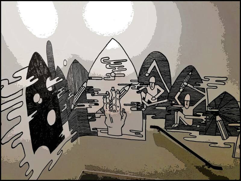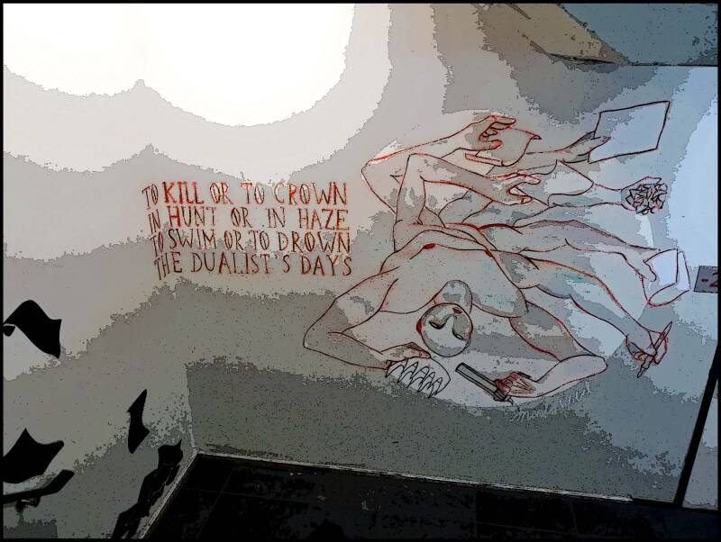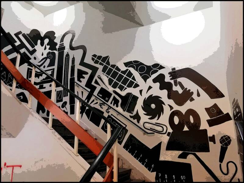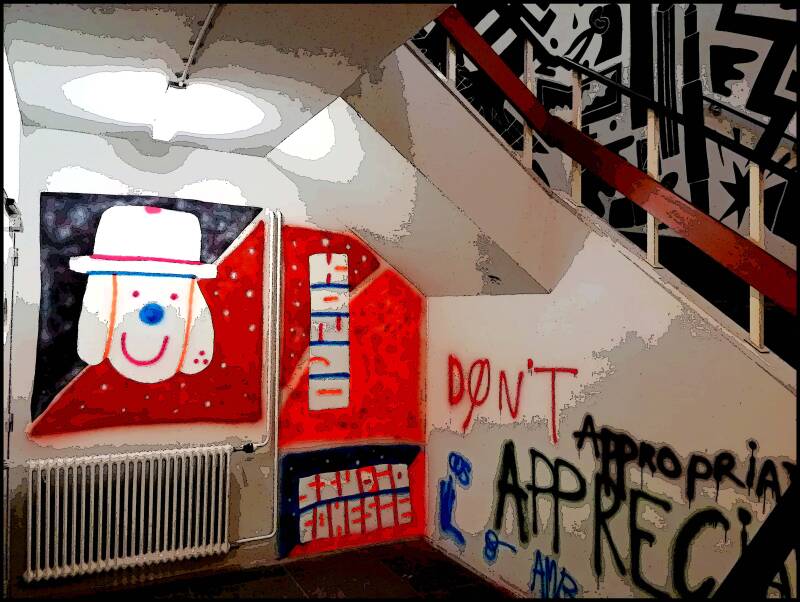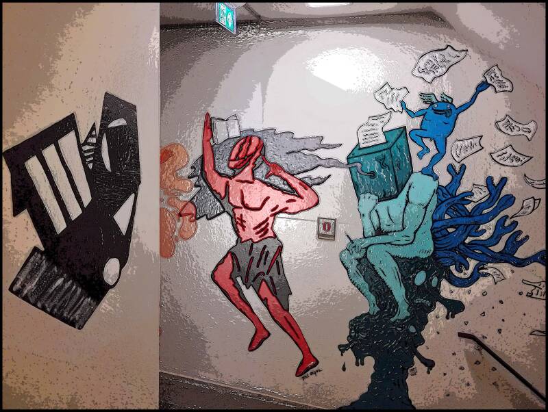 Voor het eerst daalde ik dit jaar even af naar beneden in het gebouw en trof daar tal van bijzonder muurschilderijen. Ik heb hieronder iets er van vast willen leggen. ( af en toe een beetje willen bewerken.)
